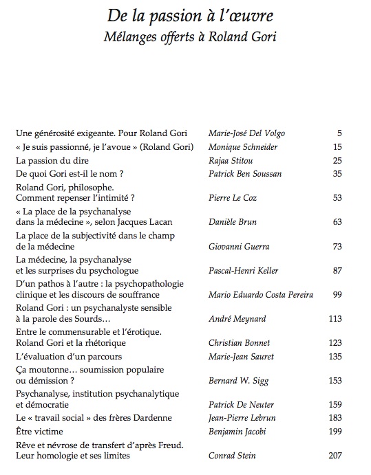 Et de passer en revue, noms et articles qui composent cet hommage : avec La passion du dire, Rajaa Stitou déplie les deux temps du parcours qui n’en font qu’un, unifié par la passion de dire et d’écrire : l’un, épistémologique et éthique, l’autre anthropologique et politique ; Patrick Ben Soussan s’interroge : De quoi Gori est-il le nom ? c’est pour dire aussi l’ombre portée sur son propre travail : périnatalité et clinique du cancer, avec de fortes réflexions sur la survivance (Derrida, Kertesz) ; avec Pierre Le Coz, l’inflexion est mise sur l’inscription dans une pensée de la technique : Comment repenser l’intimité dans un monde siglé ? ; Danièle Brun rappelle opportunément une intervention de Lacan au Collège de médecine en 1966 ; pointant chez ses confrères une « faille épistémo-somatique », pour situer les travaux actuels de Roland Gori et Marie José Del Volgo : la passion pédagogique ne saurait escamoter la tyrannie du désir [13] ; Giovanni Guerra rappelle de même, tant pour les médecins que les autres professionnels qui s’occupent de l’homme, écouter les hypothèses du patient requiert une compétence professionnelle (l’intelligence à deux, chère à Yves Agid) ; Pascal-Henri Keller décrit, photos et sites internet à l’appui, les surprises de l’imagerie qui méconnaîtrait la parole ; Mario Eduardo Costa Pereira met en lumière les discours de souffrance (D’un pathos à l’autre) qui sont en effet une des clés de lecture de l’oeuvre de Roland Gori ; André Meynard souligne en lui un psychanalyste sensible à la parole des Sourds ("sujets" pour lesquels sous prétexte de soin a pu se mettre en place une nouvelle façon de les faire taire) ; ça rime : Entre le commensurable et l’érotique. Roland Gori et la rhétorique par Christian Bonnet, avec pour surprise le tableau de l’Annonciation revisité par Daniel Arasse ;