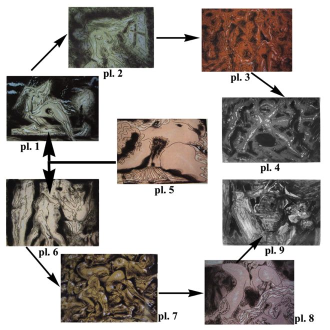 C’est une lecture. Ce n’est pas celle de Fabrice Flahutez qui se penche plus précisément sur la manière dont André Masson installe l’Origine au centre d’un dispositif de neuf gravures [15], une planche dont l’artiste fera la genèse des illustrations du récit de Bataille Le Mort. Je dirais qu’il s’agit davantage d’une lecture de Masson, de sa réception du surréalisme, de l’oeuvre de Bataille ; on n’est pas loin du découpage-collage de Duchamp [16] censé donner à l’Icare de Bruegel (celui de La chute) la place (héroïque) qui selon Breton lui revient (exposition internationale du surréalisme de 1942). C’est en ce sens, sans doute que Fabrice Flahutez écrit : « lorsque Jacques Lacan achète en 1955 le tableau de Courbet, il s’agit d’une rencontre patiemment attendue entre la série des Massacres de Masson et les écrits érotiques de Bataille dont beaucoup circulent sous le manteau. »