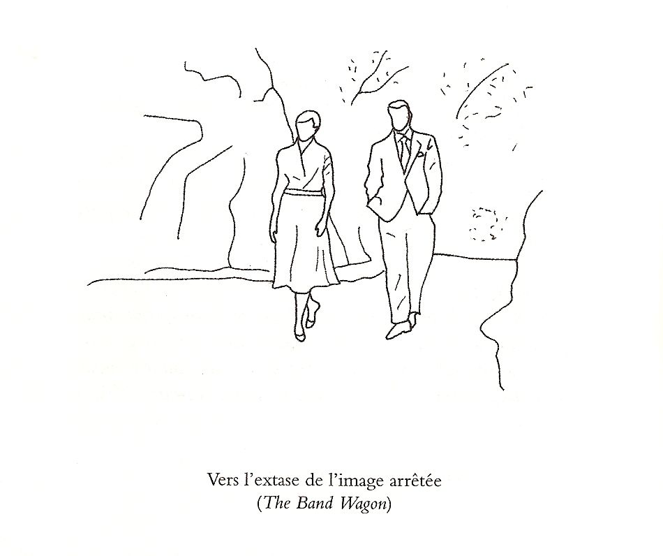 Un dessin ? ceux-ci ponctuent heureusement le texte, celui de la page 76 est parfait, sous-titré : Vers l’extase de l’image arrêtée (The Band Wagon). Juste « l’explication », que je prends à la même page : « C’est une scène d’amour, qui se déroule pas à pas, ralentie, promise à l’arrêt, l’espace se fige, le temps se suspend, on avance vers l’extase de l’image arrêtée. Exact contrepoint de la danse ». [5]