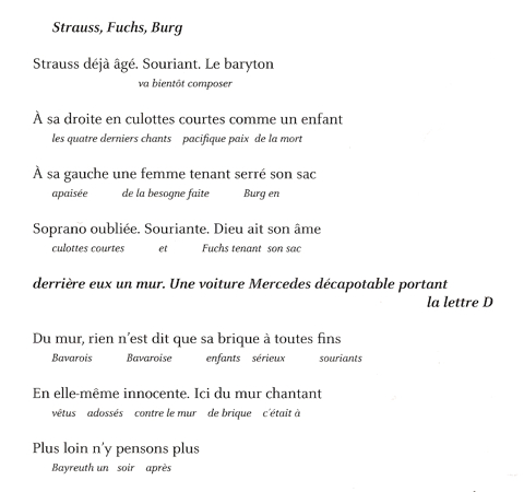 Et nous n’avons rien dit de En regard, de facture plus classique : cf. les notes en marge d’un article, sauf qu’ici c’est la vie dans sa diversité, le grand comme le trivial qui éclairent le poème,comme les bulles du texte numérique ou les liens qui emmènent parfois très loin ! C’est l’amie originaire républicaine espagnole qu’on retrouve obombrée à Saint-Gervais (p. 69) tandis qu’"un monsieur pisse" en marge, c’est le cas de le dire.
